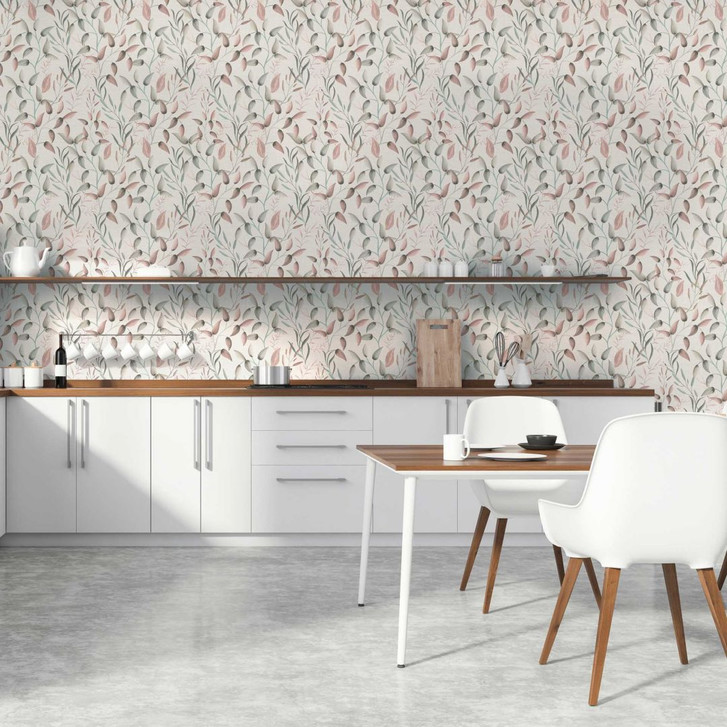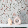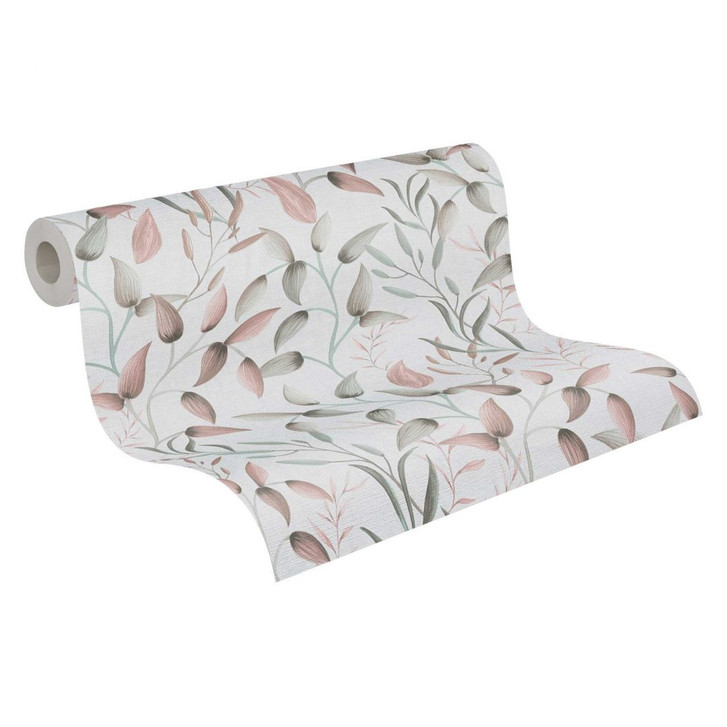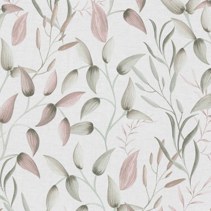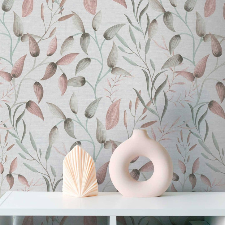 Pintwalls II - Zarte Vliestapete mit filigranem Blättermuster in Rosa, Grün und Beige für eine natürliche und elegante Wandgestaltung.