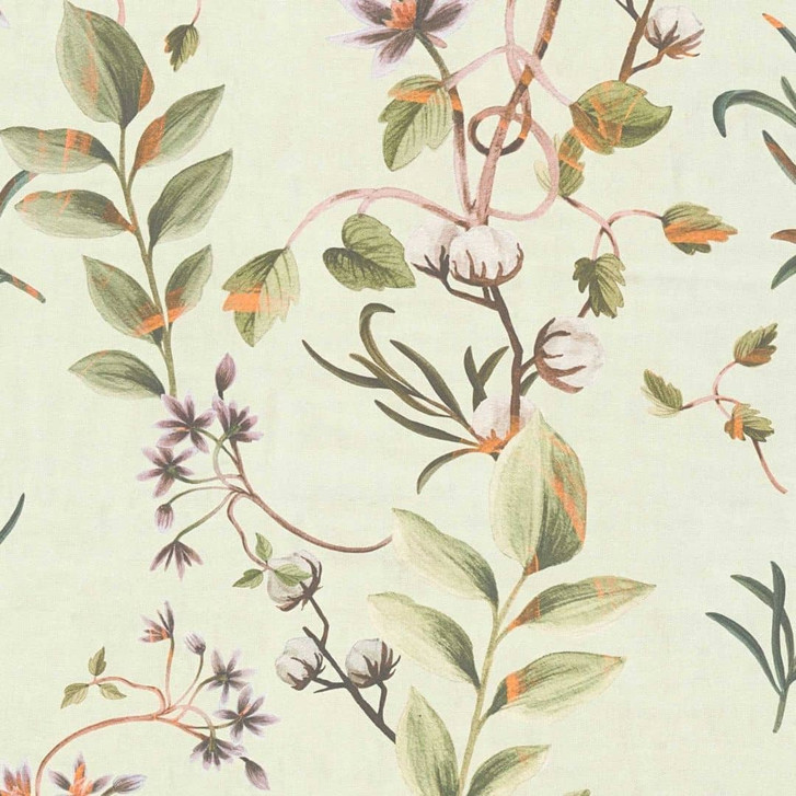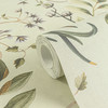 Anna D'Andrea - Zarte Vliestapete mit weißen Blüten, feinen Ranken und Blättern in Grüntönen auf hellem Untergrund.