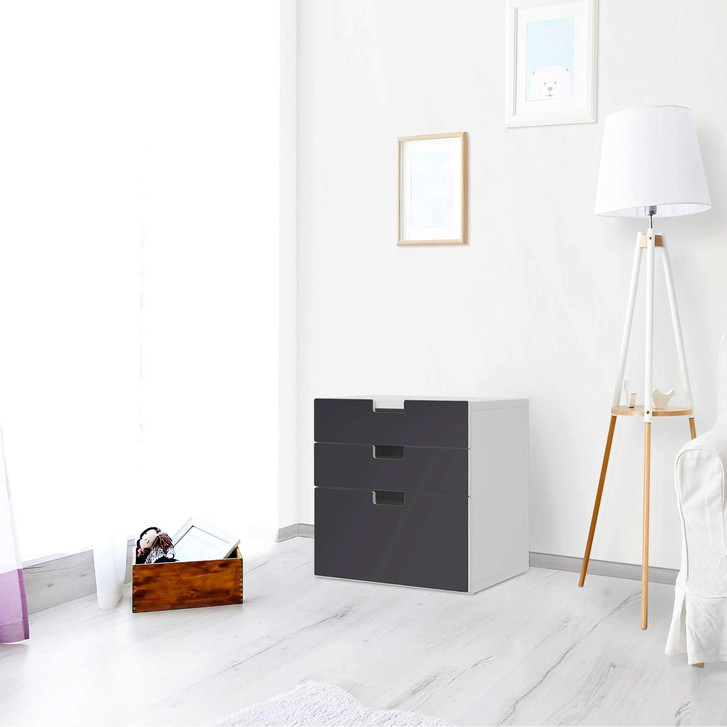 Unsere Folie Grau Dark für die Stuva Kommode - 3 Schubladen ist der Blickfang im Wohnzimmer. Unsere Dekofolien sind hochwertige, selbsthaftende Vinylfolien (seidenmatt) und können dank Bubble-free Technologie kinderleicht verklebt werden.