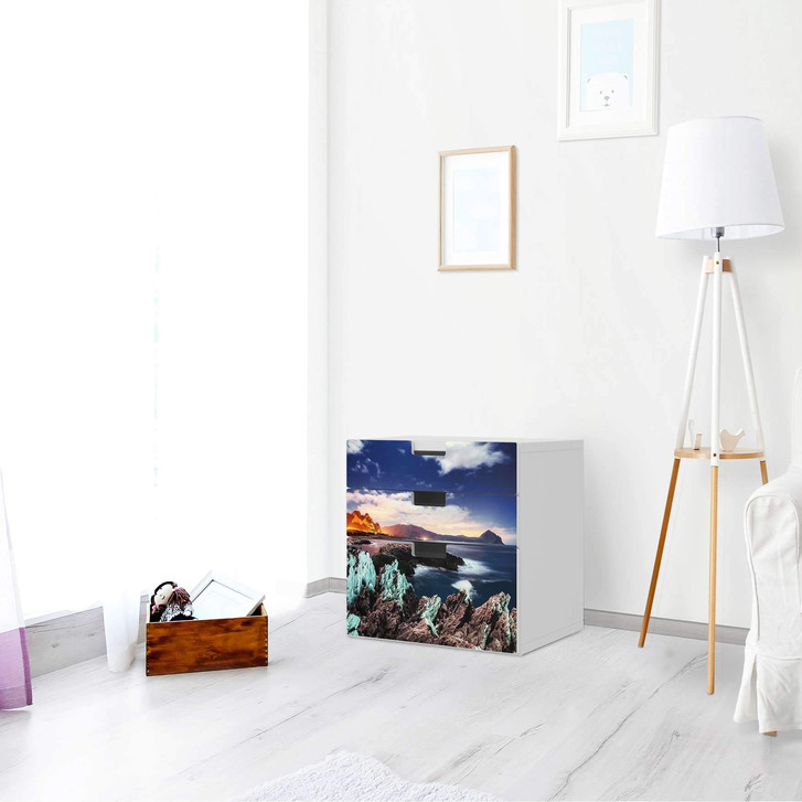 Unsere Folie Seaside für die Stuva Kommode - 3 Schubladen ist der Blickfang im Wohnzimmer. Unsere Dekofolien sind hochwertige, selbsthaftende Vinylfolien (seidenmatt) und können dank Bubble-free Technologie kinderleicht verklebt werden.