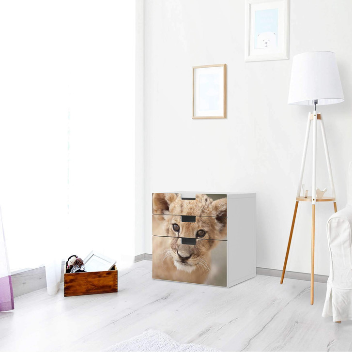 Unsere Folie Simba für die Stuva Kommode - 3 Schubladen ist der Blickfang im Wohnzimmer. Unsere Dekofolien sind hochwertige, selbsthaftende Vinylfolien (seidenmatt) und können dank Bubble-free Technologie kinderleicht verklebt werden.