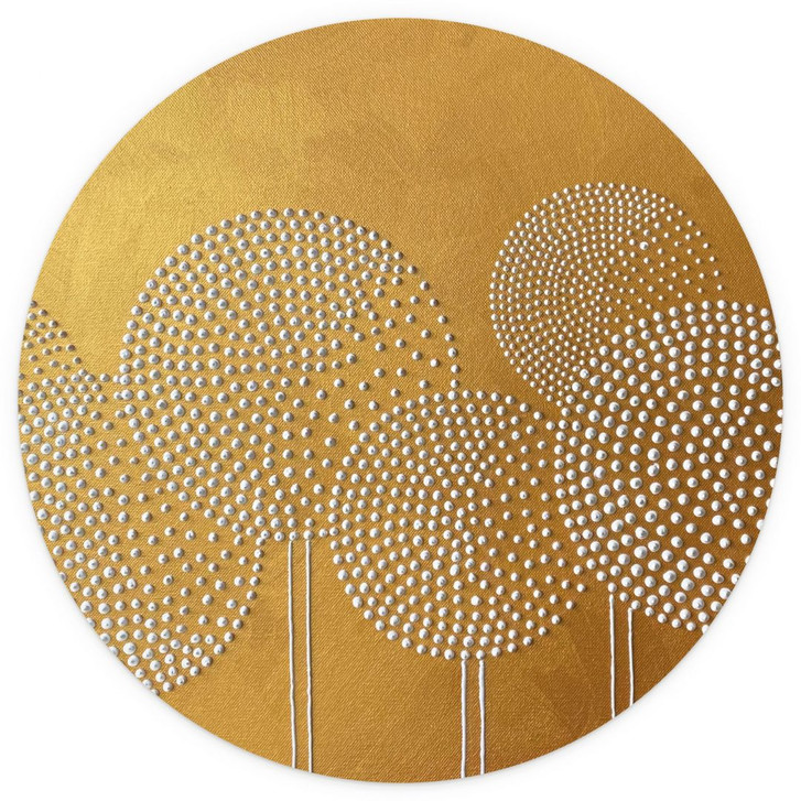 Verschönere dein Zuhause – wir bieten Fototapeten an, die eine beruhigende Atmosphäre schaffen. Mit diesem Werk hat die Künstlerin Alla Grande ein aussergewöhnliches Motiv geschaffen, das Schlichtheit, Eleganz und Wärme zugleich ausstrahlt. Das Allround-Talent widmet sich dem Thema Natur und verwendet in ihren Bildern abstrakte Elemente. Dadurch entstehen oft monochrome und minimalistische Bilder. Und dieser Kunstdruck zeigt abstrakte Blumen mit weissen Perlen, die zu runden Blütenköpfen geformt wurden. Der goldfarbene Hintergrund passt wunderbar zu den puristisch dargestellten Pflanzen. Die Vliestapete kann im Flur, Wohnzimmer, Schlafzimmer, Bad oder in der Küche angebracht werden, wo sie ihre künstlerische Wirkung frei entfalten kann. Das Motiv im runden Format lässt das Design besonders schön aussehen.