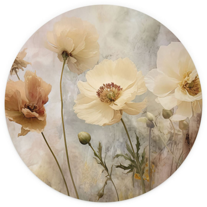 Bilge Paksoylu präsentiert mit dieser runden Tapete ein florales Kunstwerk, das durch sanfte Farben und ein harmonisches Design besticht. Die Blüten in zarten Pastelltönen wie Creme, Beige und zartem Rosé scheinen aus dem Hintergrund hervorzutreten und schaffen eine natürliche Eleganz. Die runde Form unterstreicht die Harmonie des Designs und verleiht deiner Inneneinrichtung einen modernen Touch.