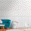 Wallpanel - Bunte Fototapete mit Aquarellpunkten und weißer Holzpaneel-Optik – ideal fürs Kinderzimmer, kreativ & fröhlich.