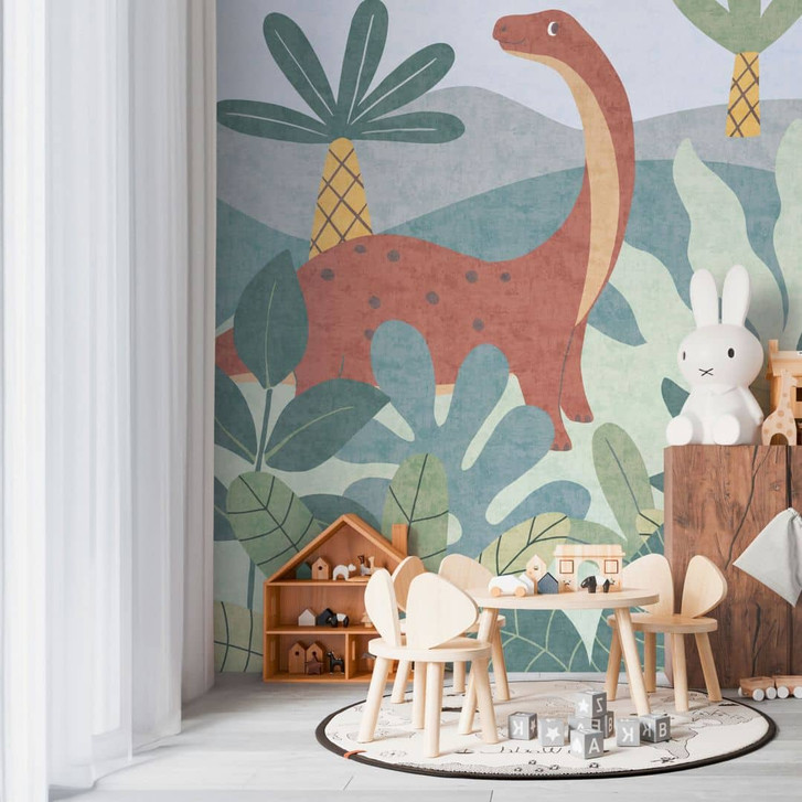 Lilly & Luis - Bunte Dino-Tapete mit Pflanzen und Urzeit-Flair, erweiterbar und leicht anzubringen.