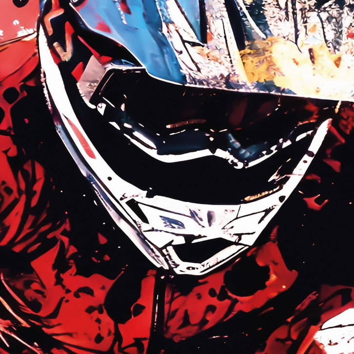 Die Fototapete zeigt einen Mountainbiker in einer leuchtend roten Jacke, der sich mit voller Konzentration und Geschwindigkeit über anspruchsvolles Gelände bewegt. Die intensiven Farben, kombiniert mit künstlerischen Farbexplosionen und dynamischen Linien, erzeugen ein Gefühl von Bewegung und Adrenalin, das deine Räume auf einzigartige Weise belebt.