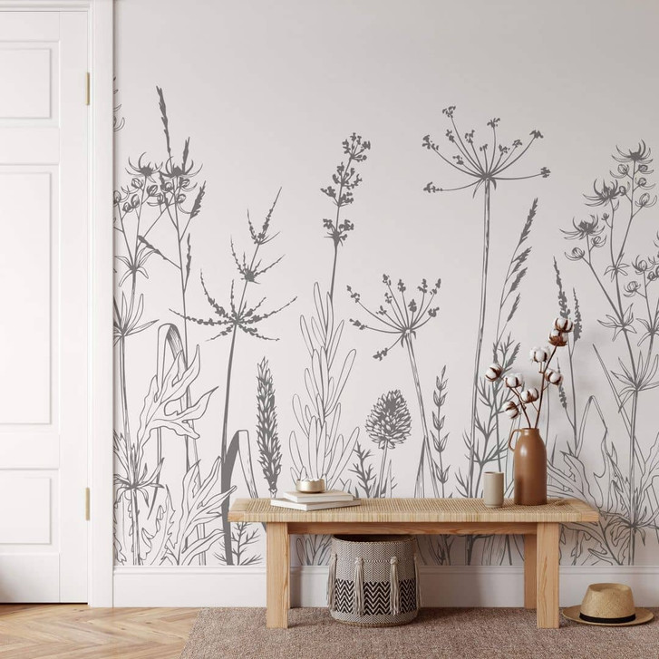 Dekoriere originell und schaffe mit unseren Fototapeten ein entspanntes Wohnambiente! Geniesse den Anblick einer schwarz-weissen Wiesenillustration. Die Wildblumen und Wiesenkräuter bringen ein tolles Naturgefühl in dein Zuhause!
