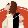 Die minimalistischen Figuren stehen vor einem leuchtend orangefarbenen Kreis, der eine lebendige und zugleich beruhigende Atmosphäre schafft. Die stilvolle Rücken-an-Rücken-Position der beiden Figuren symbolisiert Vertrauen, Ausgeglichenheit und Zusammenarbeit. Die zarte Blume in der Hand einer Figur fügt ein Element der Hoffnung und Zärtlichkeit hinzu.