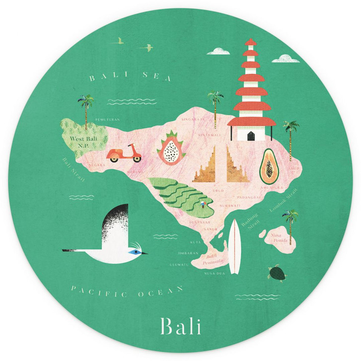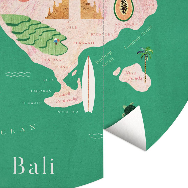 Die Aufschriften „Bali Sea“ und „Pacific Ocean“ rahmen die Insel perfekt ein, während der Name „Bali“ in stilvollen Buchstaben am unteren Rand der Tapete prangt. Diese runde Fototapete beeindruckt durch ihre brillanten Farben und feinen Details und schafft eine entspannte und inspirierende Atmosphäre. Ob im Wohn- oder Schlafzimmer, sie verleiht jedem Raum eine exotische und kulturelle Note, die zum Träumen und Entdecken einlädt. Hol dir die Schönheit und das Abenteuer Balis direkt an deine Wand und lass dich jeden Tag von dieser tropischen Oase verzaubern.