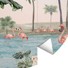 Exotische Vögel in Rosa: Flamingos sind in Afrika, Mittel- und Südamerika sowie Südeuropa zu finden. Sie fühlen sich dort am wohlsten, wo es warm ist und Wasser gibt. Diese kleine Flamingokolonie hat sich in einer Oasenlandschaft niedergelassen. Umgeben von Palmen und einer Wasserstelle ist dies der ideale Ort zum Verweilen und Entspannen. Hol dir einen Hauch tropisches Flair nach Hause! Ob im Badezimmer, im Wohnzimmer oder im Kinderzimmer, diese paradiesische Landschaft verleiht der Wand einen frischen Anstrich und strahlt Gemütlichkeit aus.