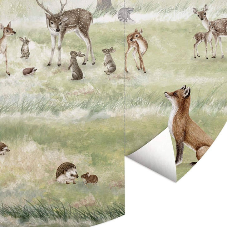 Grossflächiges Landschaftsmotiv mit Tieren und Bäumen, das wunderbar in ein Kinderzimmer passt