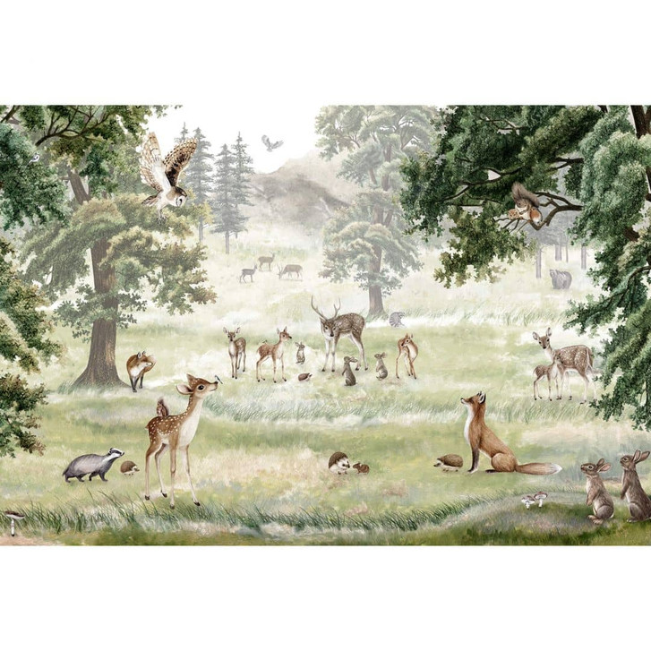 Grosses Landschaftsmotiv mit Tieren und Bäumen, das wunderbar in ein Kinderzimmer passt.
