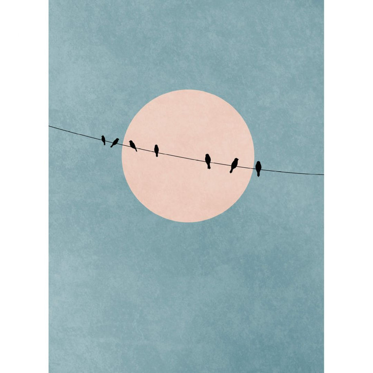 Dieses Bild zeigt kleine Spatzen, die auf einem dünnen Seil sitzen und die Abendruhe geniessen. Stimmungsvoll begleitet werden sie dabei vom Vollmond.