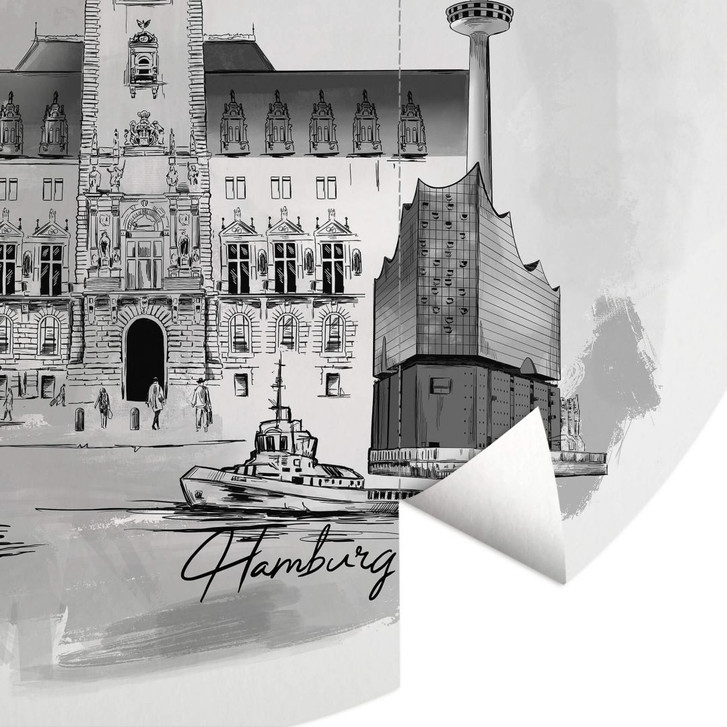 Ahoi – ein Gruss, der in Hamburg verwendet wird. Die Hansestadt Hamburg ist eine Stadt, die viele Attraktionen zu bieten hat: UNESCO-Speicherstadt, Elbphilharmonie oder das Hamburger Rathaus und viele weitere Highlights warten auf Besucher aus aller Welt. Hamburg ist nicht nur eine moderne Stadt im Norden Deutschlands – die Hafenstadt an der Elbe hat auch eine romantische und idyllische Seite. Das schwarz-weisse Stadtmotiv zeigt die facettenreiche Stadt mit ihren bekanntesten Wahrzeichen und bringt Einheimische und Reisende gleichermassen zum Schwärmen. Dieses exklusive Wandmotiv können sich alle Hamburg-Fans jetzt als runde Fototapete nach Hause holen. Das Bild wurde mit viel Liebe und Sorgfalt handgezeichnet und besticht durch viele kleine Details. Lass dich von Love your City inspirieren und still dein Fernweh mit spannenden Sehenswürdigkeiten!