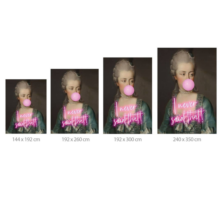 Dieses Kunstwerk verbindet auf geniale Weise die Eleganz der klassischen Malerei mit dem Witz und der Frische der modernen Popkultur. Das Porträt einer historischen Figur, kombiniert mit einer frechen pinken Kaugummiblase und dem leuchtenden Schriftzug „I never said that!“, erzeugt einen unerwarteten und humorvollen Effekt, der garantiert in jedem Raum zum Hingucker wird.