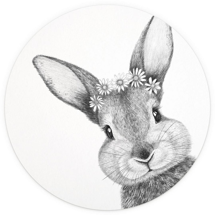 Diese runde Fototapete von Valeriya Korenkova zeigt ein bezauberndes Kaninchen, das mit einem Kranz aus Kamillenblüten geschmückt ist. Das liebevoll gezeichnete Schwarz-Weiss-Motiv bringt die Details des Fells und die Ausdruckskraft der Augen besonders gut zur Geltung. Das monochrome Design verleiht der Tapete eine zeitlose Eleganz, die in jedem Raum eine warme und stilvolle Atmosphäre schafft.