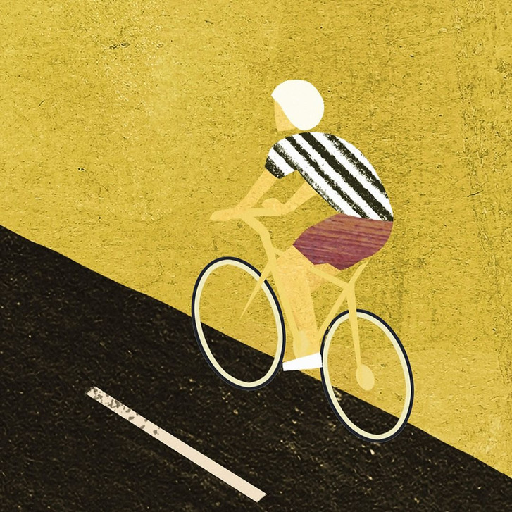 Bereichere dein Zuhause mit raffinierten Bildern und schaffe einen individuellen Aufenthaltsort! Die farbenfrohe Illustration von Rivers zeigt eine imposante Berglandschaft. Im Vordergrund fährt ein sportlicher Radfahrer die steile Strasse hinauf.