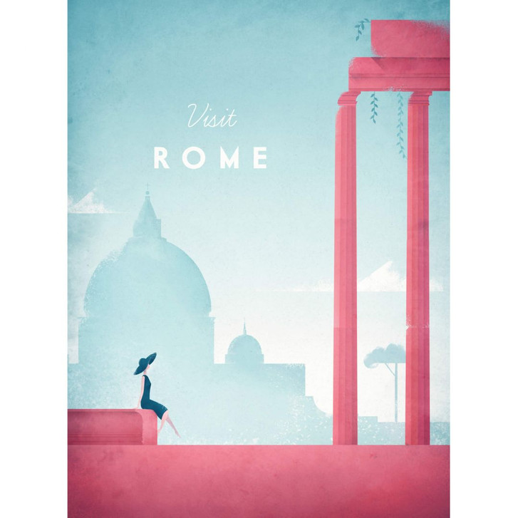 Rom, die Hauptstadt Italiens, ist eine Stadt mit historischen Gebäuden, bedeutender Kunstgeschichte und vielfältiger Kultur. Noch heute findet man antike Ruinen wie das Kolosseum, die einen in die Zeit des Römischen Reiches zurückversetzen. Eine elegant gekleidete Frau mit Hut sitzt vor antiken Säulen und betrachtet sie mit grossem Interesse. Entdecke mit Henry Rivers aufregende Orte und dekoriere mit der Aufschrift „Visit Rome“.