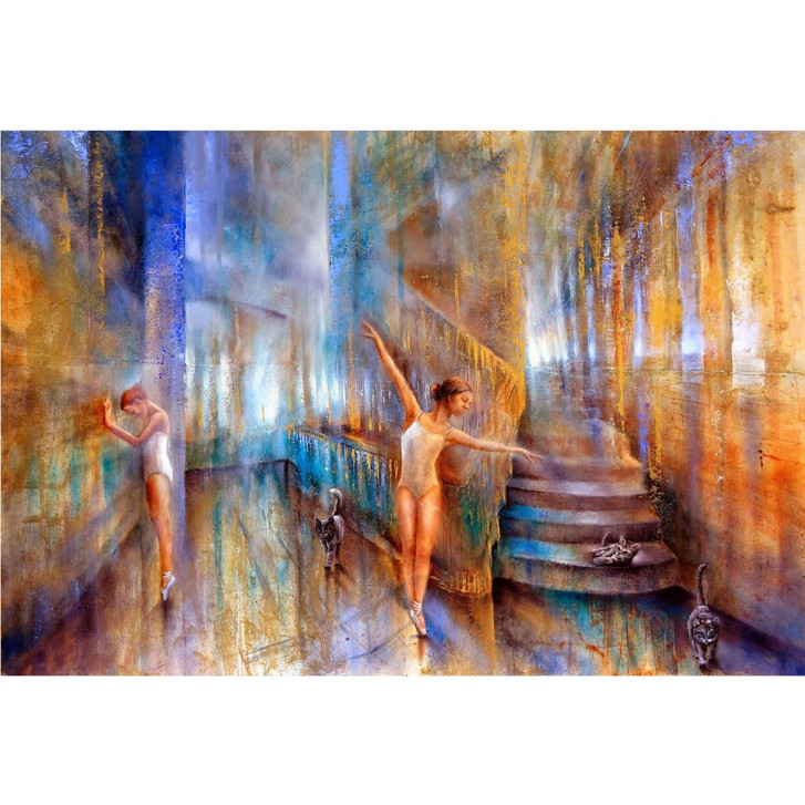 Der Kunstdruck ist in verschiedenen Blau- und Orangetönen gehalten. Annette Schmucker präsentiert zwei anmutige Ballerinas im Tanzstudio, die von neugierigen Katzen beobachtet werden.