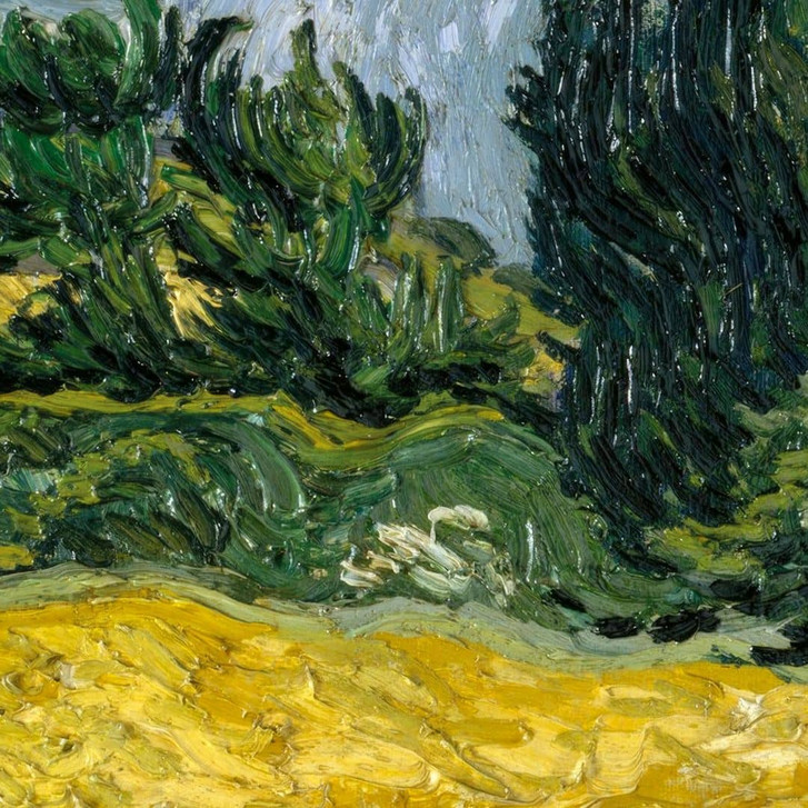 Dem Alltag entfliehen und etwas Beeindruckenderes als nur die schlichte Wand sehen? Mit der Landschaftstapete einen zeitlos schönen Look zaubern! Das Gemälde „Weizenfeld mit Zypressen“ des niederländischen Künstlers Vincent van Gogh entstand 1889 während seines Aufenthalts in Saint-Rémy-de-Provence in Frankreich. Es wird vermutet, dass die Landschaft zunächst als Rohrfederzeichnung entstand, bevor sie mit Kohle auf Leinwand übertragen und anschliessend mit Ölfarbe fertiggestellt wurde. Dafür verwendete der Künstler leuchtende, kräftige Farben, die im impressionistischen Stil ausgeführt sind. Die grobe Pinselführung und die von der Realität abweichende Darstellung deuten jedoch auch auf einen beginnenden Übergang zum Expressionismus hin.