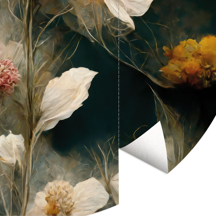Diese kreisförmige Fototapete von Treechild kombiniert zarte Blumen mit einem tiefen, stimmungsvollen Farbschema, um deinem Raum eine besondere Ausdruckskraft zu verleihen. Die zarten, cremeweissen Blüten entfalten sich anmutig vor einem tiefgrünen Hintergrund und schaffen ein beeindruckendes Zusammenspiel von Leichtigkeit und Eleganz. Die sanften Farbverläufe und filigranen Details verleihen dem Motiv eine fast schwebende Anmut.