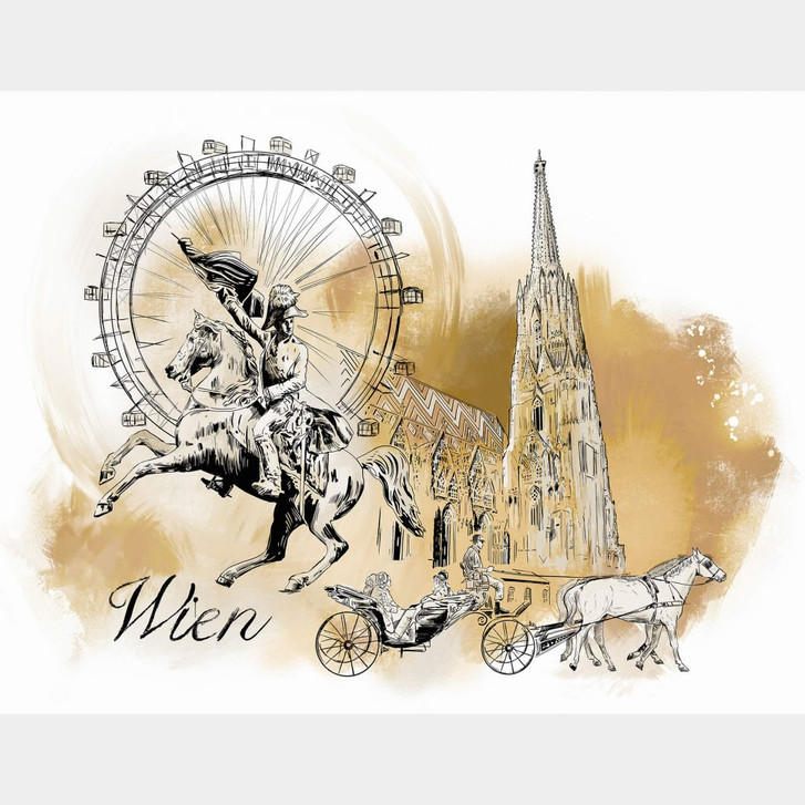Möchtest du dein Zuhause neu dekorieren und brauchst Inspiration? Dieses Wandbild verleiht dir einen neuen, frischen Look! Die Kollektion „Love your City“ ist exklusiv bei trenddeko.ch erhältlich. Der Künstler zeigt die Wahrzeichen der Stadt, die jeder Tourist gesehen haben muss: das Riesenrad im Vergnügungspark Prater, den Stephansdom, das Reiterstandbild von Erzherzog Karl und eine Pferdekutsche.