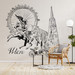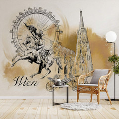 Individualität ist gefragt: Die Inneneinrichtung spiegelt oft die eigene Persönlichkeit wider. Mit Deko-Accessoires und Bildern aus verschiedenen Themen und Stilen lässt sich ein neuer Look mit individuellem Charme kreieren. Der schwarz-weisse Kunstdruck zeigt die wichtigsten Sehenswürdigkeiten der Stadt: das Riesenrad im Prater, den Stephansdom, das Reiterstandbild von Erzherzog Karl und eine Pferdekutsche.