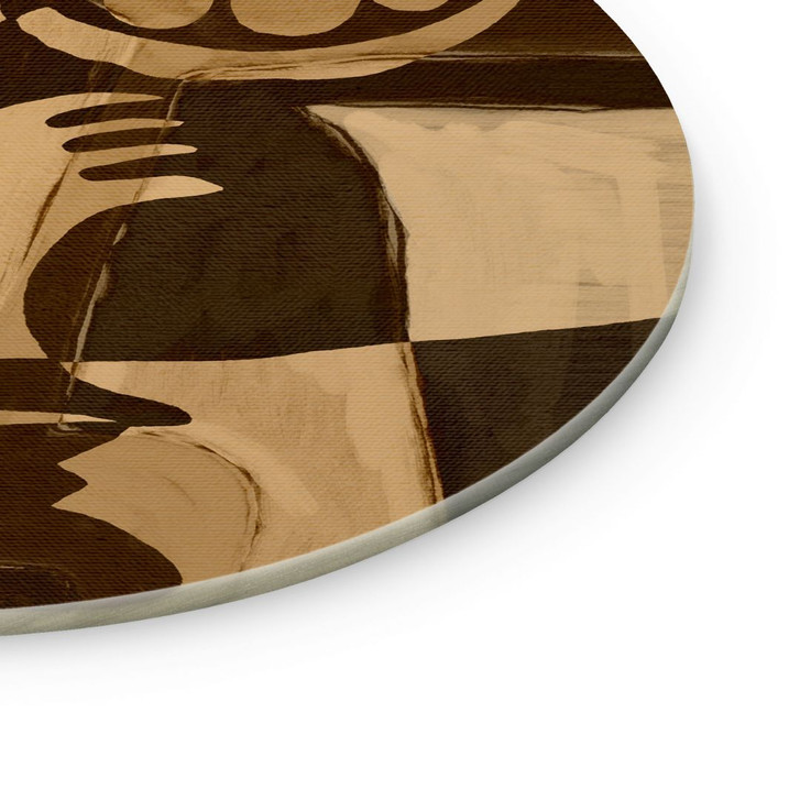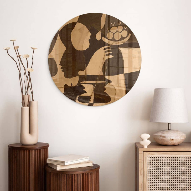 Rundes Glasbild mit abstrakter Komposition in warmen Erdtönen