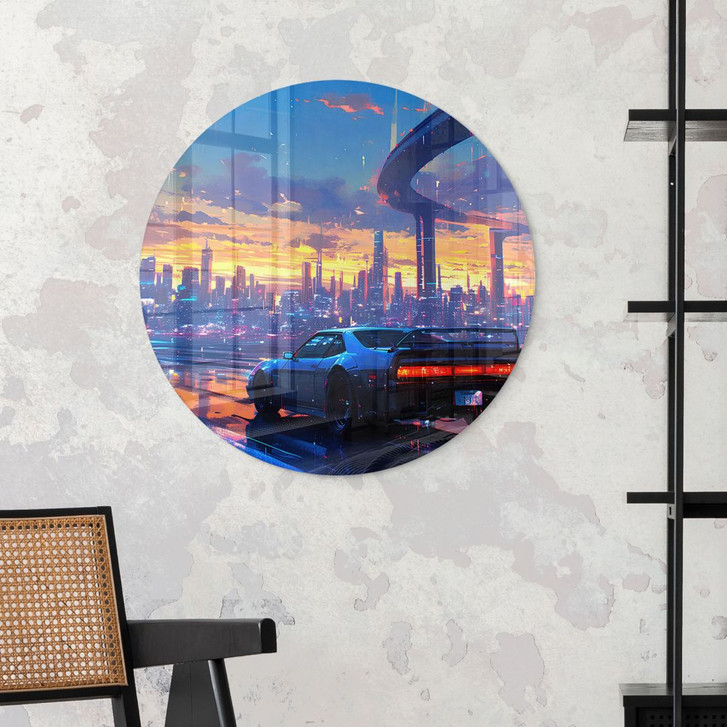 Mit diesem runden Glasbild holst du dir futuristische Raffinesse und moderne Kunst direkt nach Hause. Das Bild zeigt ein sportliches Auto, das durch eine regennasse Strasse fährt, während im Hintergrund die Lichter einer neonbeleuchteten Metropole erstrahlen. Der glühende Sonnenuntergang trifft auf das nächtliche Leuchten der Stadt und erzeugt ein atemberaubendes Farbenspiel in Blau-, Orange- und Violetttönen, das den Raum in ein magisches Licht taucht.