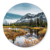 Dieses runde Glasbild fängt auf einzigartige Weise die Ruhe und Eleganz einer unberührten Berglandschaft ein. Ein stiller See spiegelt die warmen Herbstfarben wider, während schneebedeckte Gipfel im Hintergrund die Szenerie majestätisch abrunden. Der tiefblaue Himmel und die weichen Wolken vervollständigen das Panorama und verleihen dem Motiv Tiefe und Weite.
