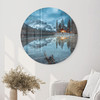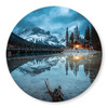 Dieses runde Glasbild zeigt die Abendstimmung am Emerald Lake im Yoho-Nationalpark in Kanada. Umgeben von einer majestätischen Berglandschaft spiegelt sich die Szenerie perfekt im ruhigen Wasser des Sees und schafft eine faszinierende Symmetrie. Das warme Licht einer Hütte am Ufer bildet einen reizvollen Kontrast zu den kühlen Blau- und Grautönen der Natur und lädt den Betrachter ein, in die Ruhe des Augenblicks einzutauchen.