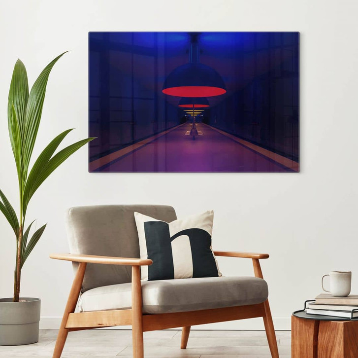 Verleihe deinen Wänden einen modernen Look – diese Wanddekoration ist eine ausgezeichnete Wahl. Das Foto von Andy Dauer zeigt den U-Bahnhof Westfriedhof in München. Die besondere Architektur schafft dort eine einzigartige Atmosphäre. Die elf Lampen leuchten in hellen Farben. An einem Ende fällt Sonnenlicht ein und teilt den Bahnsteig in verschiedene Farben.