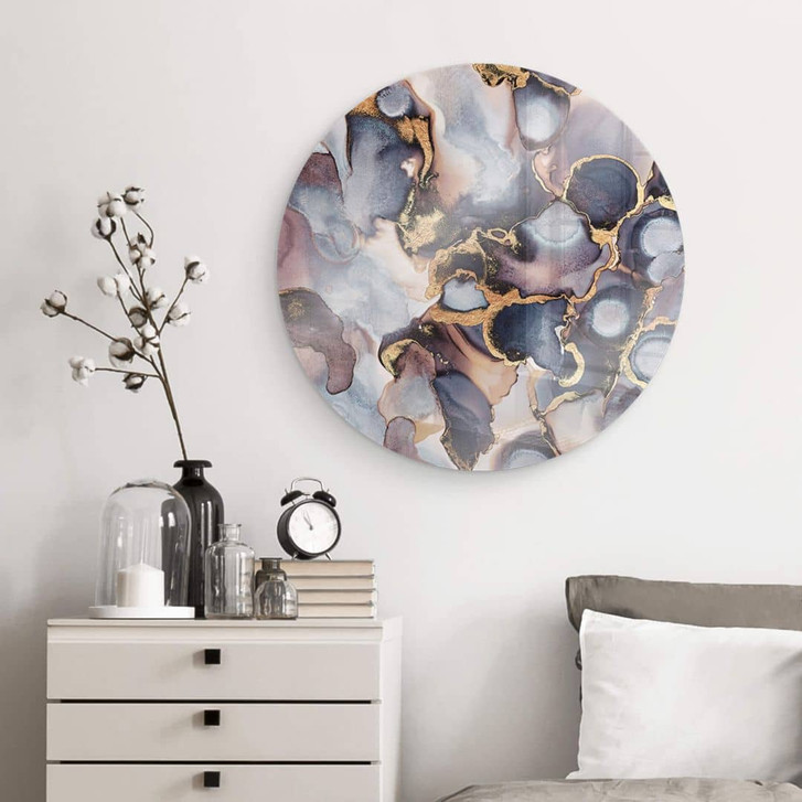 Die Verschmelzung der Farben Blau, Lila, Gold und Rosé erzeugt ein fantasievolles Farbenspiel, das alle Blicke auf sich zieht. Das abstrakte Bild im runden Format eignet sich für viele Bereiche zu Hause und am Arbeitsplatz.