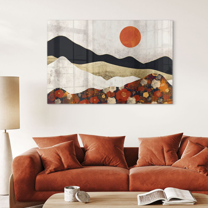 Das von SpaceFrog Designs gestaltete Glasbild zeigt eine herbstliche Berglandschaft in kräftigen Farben und klaren Linien. Die sanften Silhouetten der Berge in Schwarz und Gold ziehen sich harmonisch durch das Motiv und erzeugen ein Gefühl von Ruhe und Weite. Am unteren Bildrand fügen sich die organisch geformten floralen Muster in warmen Rot-, Orange- und Beigetönen nahtlos in die Komposition ein und verleihen dem Bild eine lebendige Note, die an die farbenfrohe Pracht eines goldenen Herbsttages erinnert.