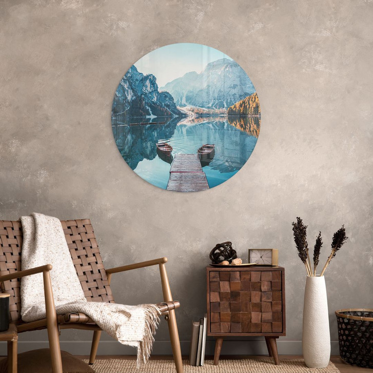 Das runde Glasbild mit dem Pragser Wildsee vereint harmonische Ästhetik und faszinierende Details. Der malerische Steg, eingerahmt von zwei Booten, lenkt den Blick über die glitzernde Wasseroberfläche auf die imposanten Berge der Dolomiten. Die herbstlich gefärbten Bäume bilden einen warmen Kontrast zu den kühlen Blautönen des Sees.
