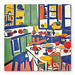 Möchtest du deiner Inneneinrichtung eine besondere Note verleihen? Dieses farbenfrohe Bild verleiht deiner Wand einen modernen Touch. Die Künstlerin Zamart liess sich bei der Gestaltung des Motivs „In der Küche“ vom Stil des französischen Malers Henri Matisse inspirieren. Es zeigt eine farbenfrohe Küche mit einer Küchentheke und einem gedeckten Tisch.