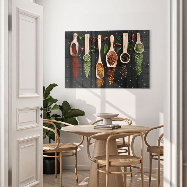 Glasbild Kräuter und Gewürze auf Holzlöffel - Dingemans