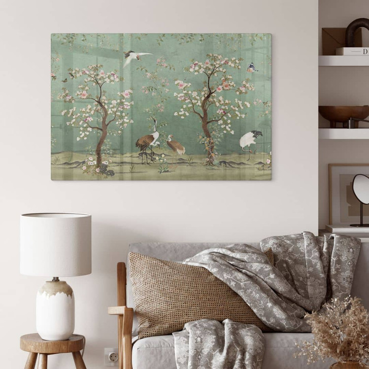 Glasbild Kraniche in floraler Landschaft - Bloomery Decor