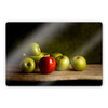 Die Stillleben-Fotografie mit dem Motiv einer Obstschale setzt harmonische Kontraste in der Anordnung eines roten und mehrerer grüner Äpfel. Das Wandbild stellt eine ausgewogene und stilvolle Wanddekoration dar. Das fotografische Kunstwerk des Fotokünstlers Luiz Laercio ist ein perfektes Motiv für die Küche oder ähnliche Funktionsräume.