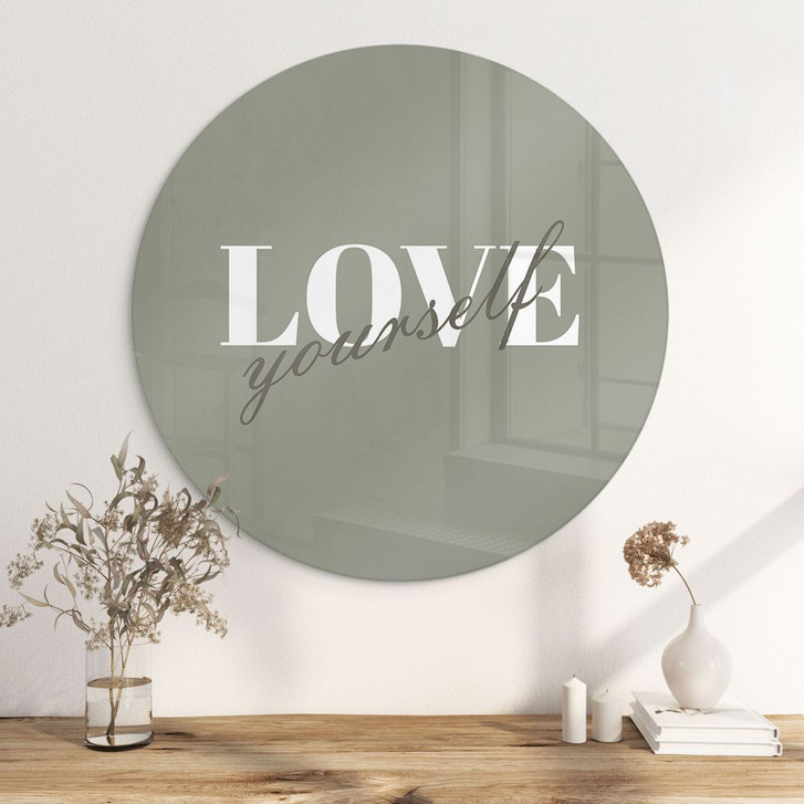 Bringe mit dem runden Glasbild „Love Yourself“ Eleganz und positive Energie in deine Räume. Die glänzende Oberfläche des Glases unterstreicht das minimalistische Design und sorgt für eine beeindruckende Brillanz, die jede Umgebung aufwertet.