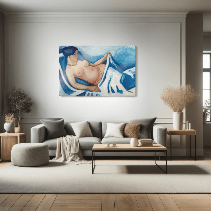 August Macke war an den Ausstellungen des „Blauen Reiter“ beteiligt und zählt zu den bekanntesten deutschen Expressionisten. Der 1887 in Meschede geborene Maler fand nach der Verarbeitung einer Reihe von künstlerischen und stilistischen Trends seinen eigenen Stil, der ihm einen hohen Wiedererkennungswert verschaffte. Der Künstler griff das Thema Frau immer wieder auf und setzte es in zahlreichen Motiven um. In dem Glasbild „Macke - Liegender weiblicher Akt“ beschränkt sich der Maler auf wenige Farben, die dem Bild dennoch eine besondere Ausstrahlung verleihen. Auch das Spiel mit dem Licht ist in diesem Kunstdruck auf Glas zu sehen, ein Effekt, den Macke in seinen Gemälden immer wieder einsetzte. Verschönere dein Schlafzimmer mit diesem harmonischen Motiv, das in drei Grössen wirkungsvoll zur Geltung kommt.