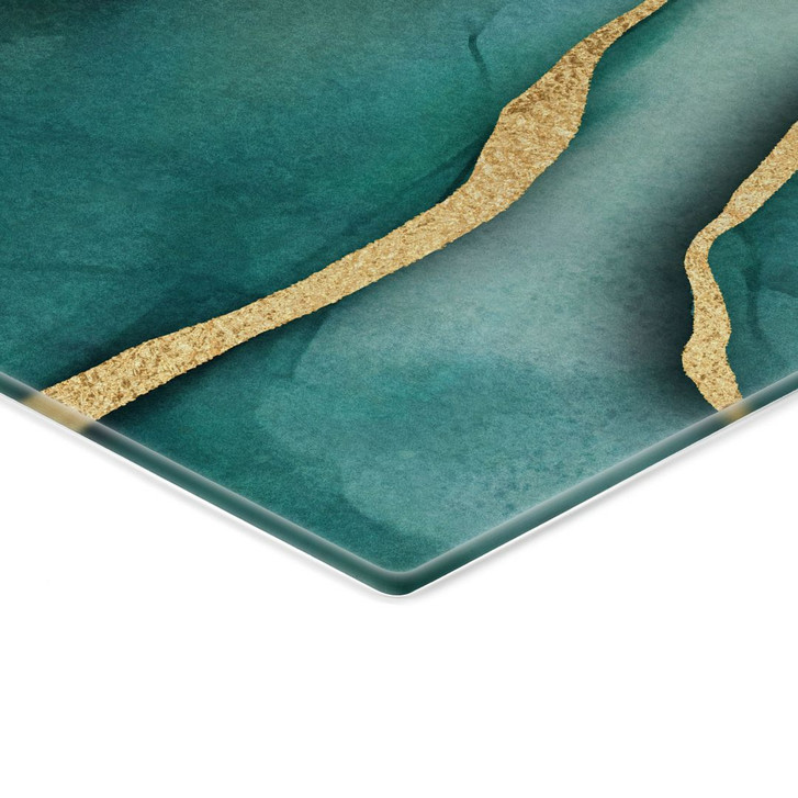 Setze die Wände in Szene – mit diesem Wandbild kannst du einen tollen Look kreieren! Mit diesem hochglänzenden Glasbild verleihst du der Wand im Handumdrehen einen frischen Look. Das Aquarellbild von Haase zeigt ein grünes Marmor-Design mit goldfarbenen Akzenten. Die abstrakte Steinoptik wirkt zeitlos, ästhetisch und schlicht zugleich und schafft eine Atmosphäre zum Wohlfühlen. Ob im Büro, in einer Praxis oder in den eigenen vier Wänden: Dekoriere deine Wände stilvoll mit dem Motiv „Marmor in Gold-Grün“ als Glasbild!