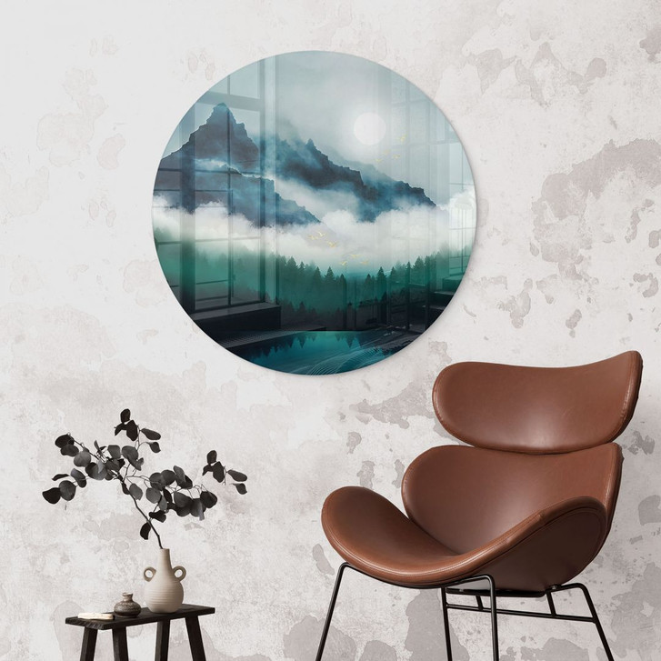 Die runde Form des Glasbildes verstärkt die weichen, fliessenden Übergänge der nebligen Landschaft und verleiht dem Bild ein harmonisches Aussehen. Die glänzende Oberfläche des Glases bringt die intensiven Farben der nächtlichen Landschaft besonders gut zur Geltung und erzeugt eine faszinierende Tiefenwirkung, die den Betrachter in die Stille und Ruhe der Natur eintauchen lässt.