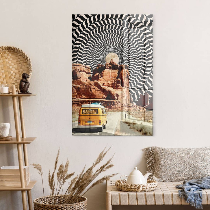 Hast du deinen eigenen Stil? Mit unserem Wandaccessoire kannst du ihn harmonisch in Szene setzen. Verleihe deinem Wohnbereich eine unverwechselbare Atmosphäre. Die Fotokunst des norwegischen Künstlers Taudalpoi zeigt einen gelben VW-Bus auf einer einsamen Strasse, die an einem Berg vorbeiführt. Über einer Bergspitze ist der Vollmond zu sehen. Hinter dem Felsen hat sich ein schwarz-weisses Loch aufgetan, sodass es scheint, als könne der Bus direkt zu einem Roadtrip zum Mond aufbrechen.