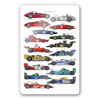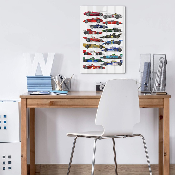 Seit der ersten Saison im Jahr 1950 ist die Formel 1 ein faszinierender Sport. Die Autos sind technische Meisterwerke und die Fahrer sind hoch angesehene Menschen. Das Bild zeigt die besten Formel-1-Autos, wann sie gefahren wurden und wie viele Siege die Fahrer mit dem Auto errungen haben. Natürlich sind auch die Rennwagen von Nikki Lauda und Michael Schumacher in David Sparshotts Kunstwerk zu sehen.