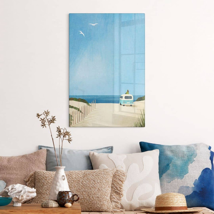 Lass dich von diesem Urlaubsmotiv an den Küstenstrand entführen. Die Illustration stammt von Henry Rivers und zeigt eine Frau, die auf ihrem Van den Blick auf das weite Meer geniesst. Der Himmel leuchtet in Blau, während die Möwen über das Meer fliegen. Ein perfektes Bild, um sich zu entspannen und von der nächsten Reise zu träumen. Mit dem Glasbild kannst du Badezimmer, Wohn- und Schlafzimmer verschönern und dir eine kleine Auszeit vom Alltag gönnen.