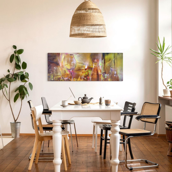 Hast du deinen eigenen Stil? Mit unserem Wandaccessoire kannst du ihn harmonisch zur Schau stellen. Verleihe deinem Wohnbereich eine unverwechselbare Atmosphäre. Der farbenfrohe Kunstdruck von Schmucker zeigt ein Stillleben im Panoramaformat. Auf einem Tisch sind verschiedene Gläser und Vasen arrangiert.