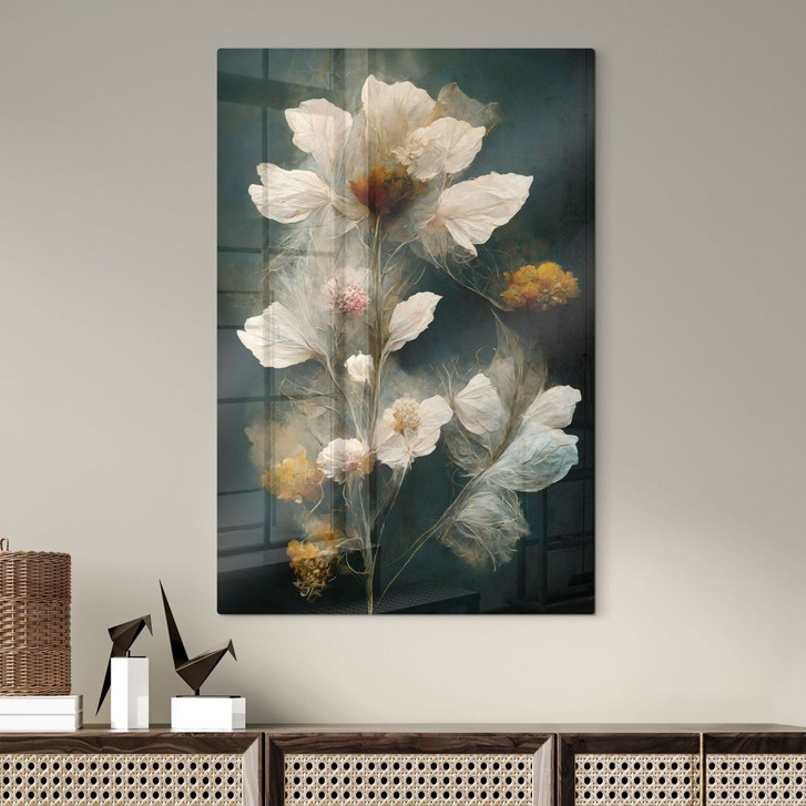 Dieses hochwertige Glasbild von Treechild bringt die vergängliche Schönheit zarter Blumen in einzigartiger Brillanz zur Geltung. Die sanften Creme- und Goldtöne der Blumen entfalten sich vor einem tiefgrünen Hintergrund und erzeugen eine faszinierende Tiefe. Die detaillierten Blätter und Blüten wirken fast schwerelos und verleihen dem Motiv eine poetische, elegante Ausstrahlung.
