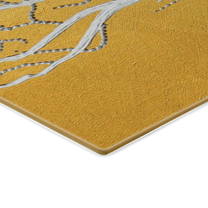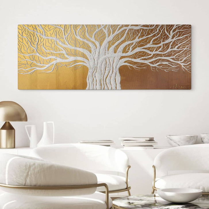 Dieses exklusive Glasbild fängt die eindrucksvolle Symbolik des Lebensbaums in einer eleganten und modernen Darstellung ein. Die weit verzweigten Äste des weissen Baums stehen für Wachstum, Stärke und Verbundenheit. Der strahlende Goldverlauf im Hintergrund verleiht dem Motiv eine aussergewöhnliche Tiefe und schafft eine luxuriöse, warme Atmosphäre. Die Panoramaform betont die majestätische Wirkung des Baumes und macht dieses Kunstwerk zu einem ausdrucksstarken Blickfang.