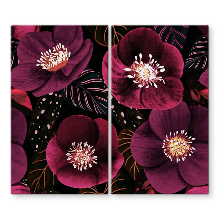 Dieses kunstvolle Design von Anis Illustration bringt die luxuriöse Schönheit floraler Motive direkt in die Küche. Die tiefvioletten Töne der Blüten entfalten auf dem dunklen Hintergrund eine faszinierende Strahlkraft, während zarte Blattstrukturen in Gold- und Rottönen stilvolle Akzente setzen. Die moderne Komposition erzeugt eine aussergewöhnliche Tiefe und macht diese Kochfeldabdeckung zu einem echten Hingucker.